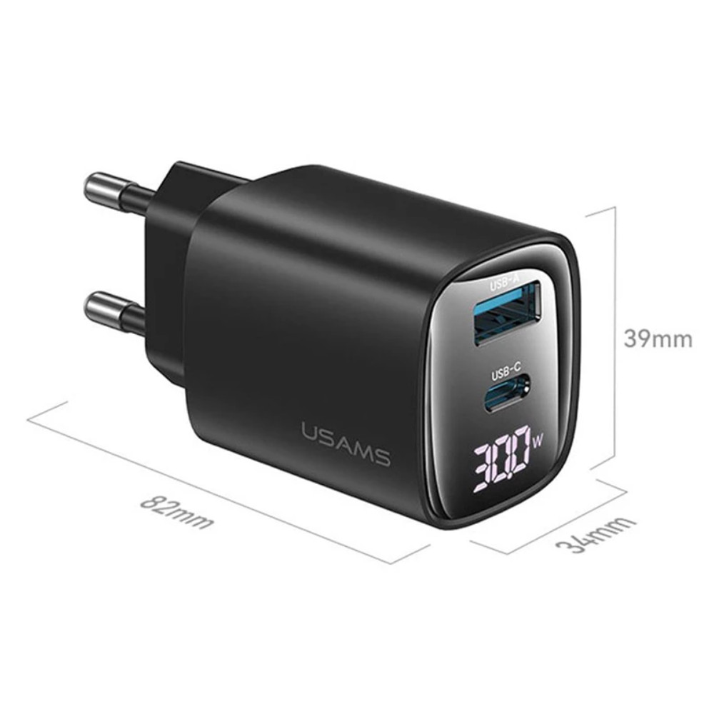 USAMS® GaN USB hálózati töltő adapter, 30W gyorstöltés, 2 port, LCD kijelző, túlterhelés elleni védelem, fekete