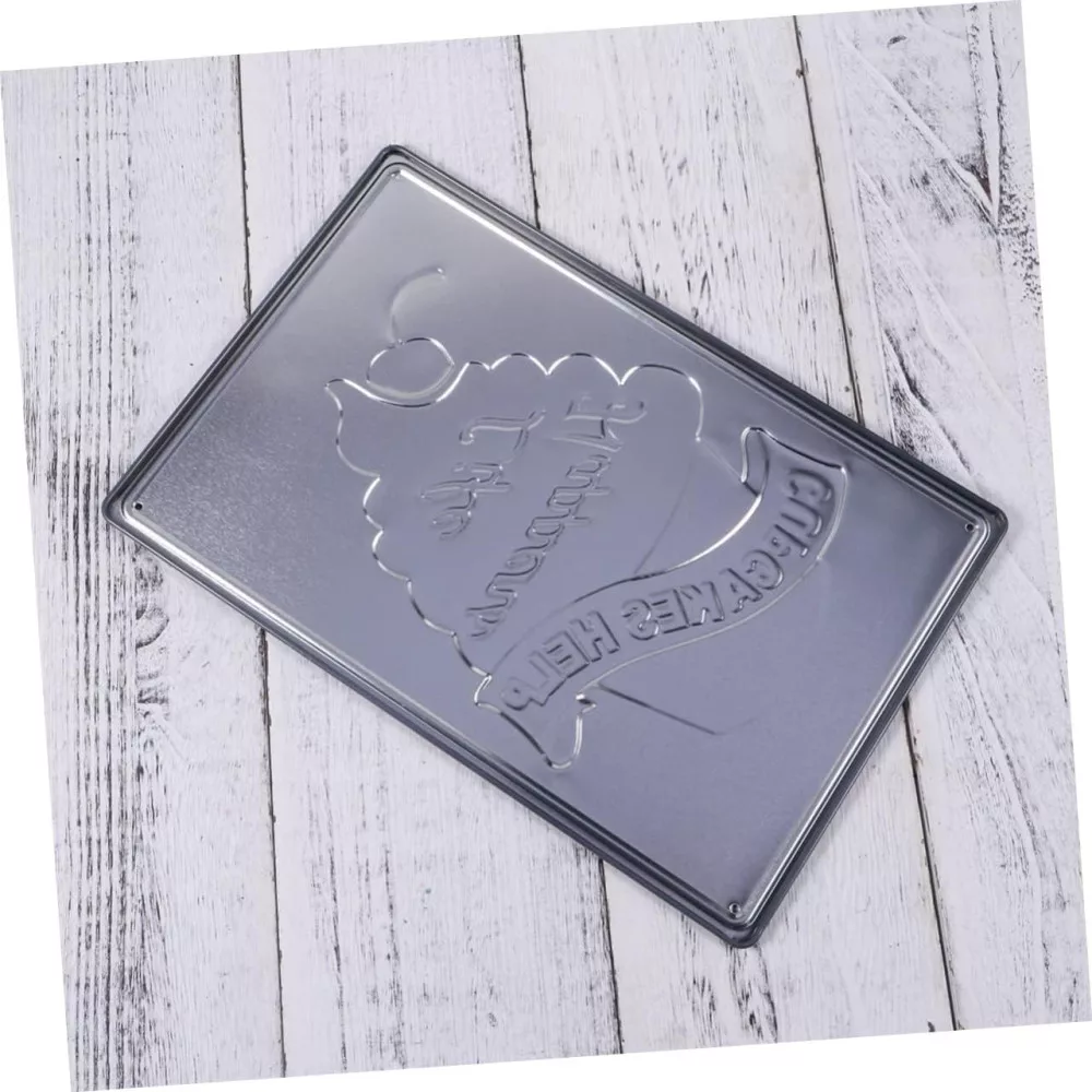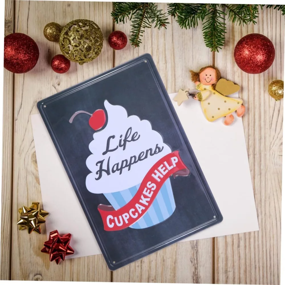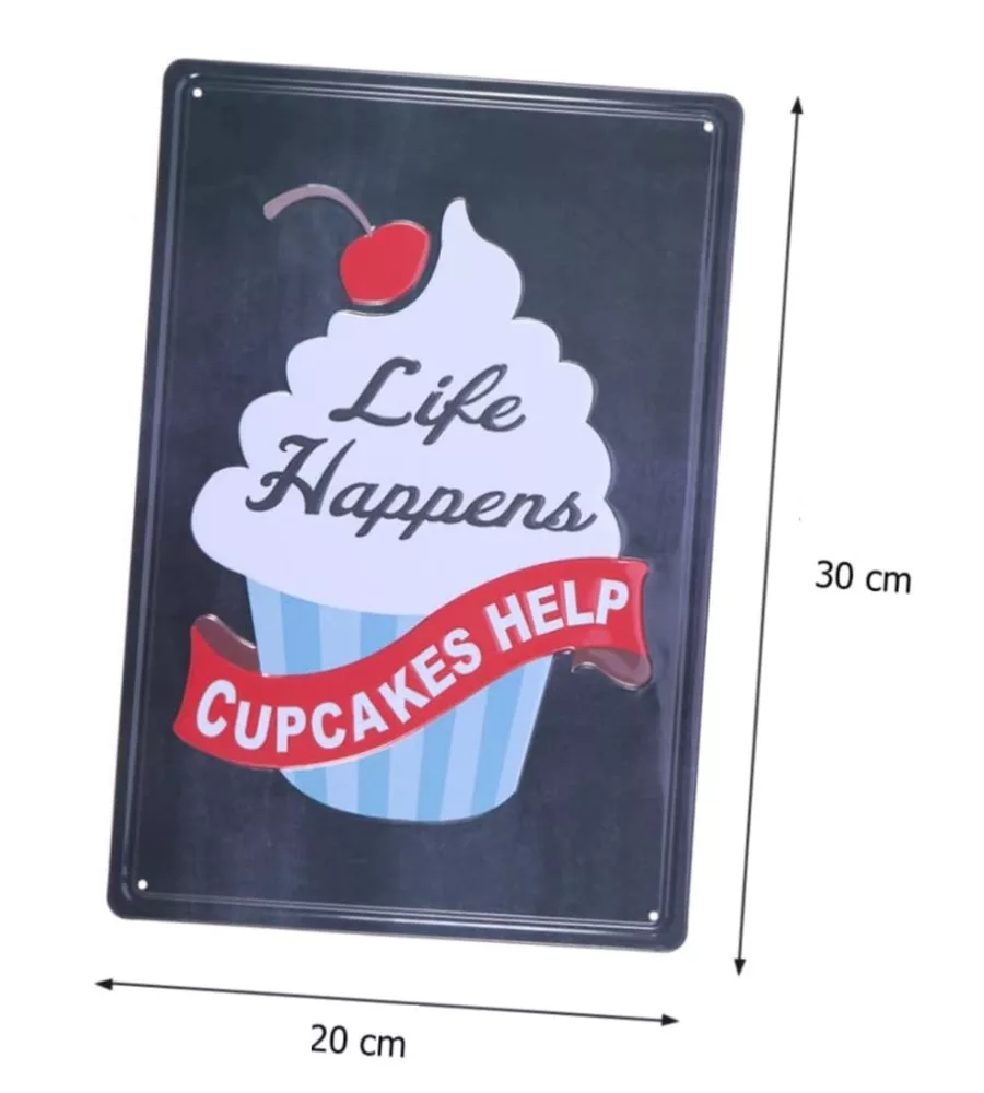 Ez a gyönyörű vintage dombornyomott fémtábla 'Life Happens CUPCAKES HAPPEN' felirattal egy időutazást kínál a múltba és lenyűgöző módon örökíti meg a sütemények világát.