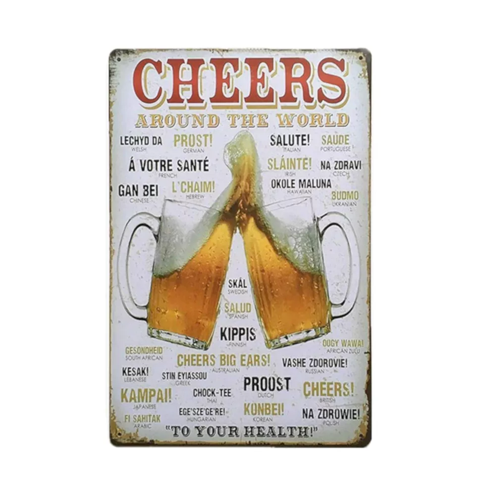 Ez a gyönyörű vintage sörös dombornyomott fémtábla 29 különböző nyelven felsorolja hogyan mondjuk: 'Egészségedre!'