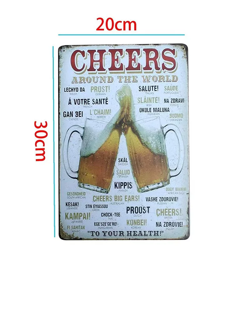 Vintage Dekor Fémtábla, dombornyomott 'CHEERS' felirat, retro hangulatú kialakítás, 'Egészségedre!' 29 nyelven, 20x30cm